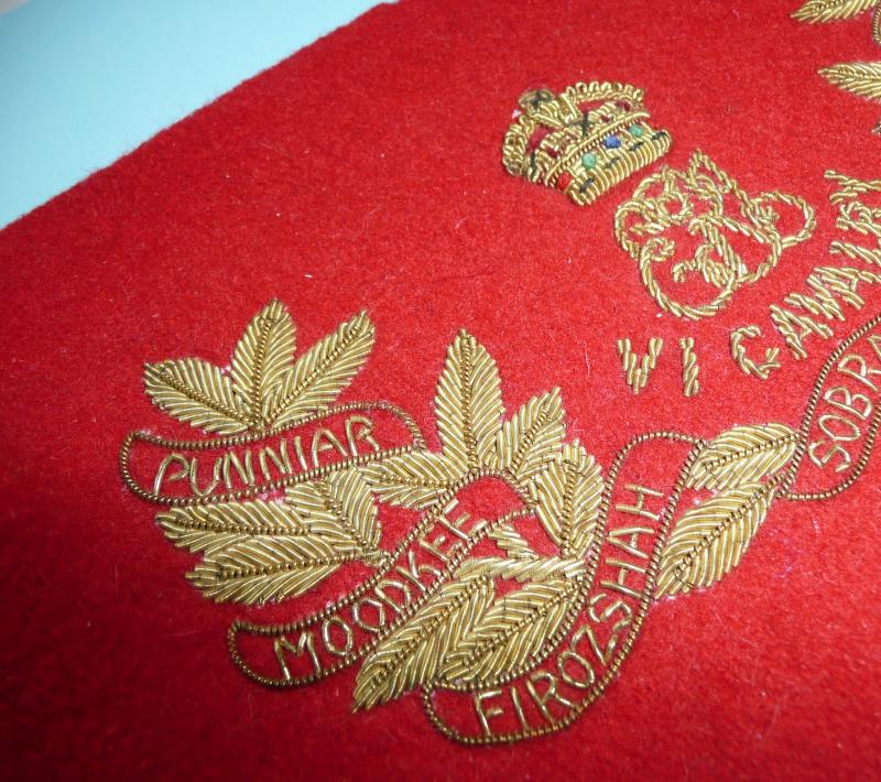 Most probably intended for use as the bullion ornament for embellishing a review order officer's dress pouch. Similar in design to that depicted in Ashok Nath's "Sowars and Sepoys in the Great War 1914-1918 for the Governor General's Body Guard (Fig 2). Scarlet background is correct facings colour for this Regiment. Battle honours exclude WW1 honours. EDVII cypher to centre. A rare pre WW1 survivor with no moth, damage or fading. The panel is circa 20cms by 12cms. I cannot imagine what such a piece would cost today to make. Complete with original paper backing. Would make a great display item. Or if you have a tired pouch that needs restoring! Stunning.