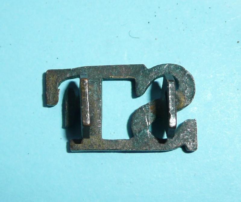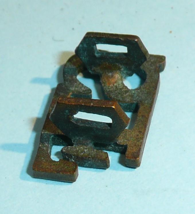 Most probably worn from 1902 with the introduction of Officer's Service Dress but Westlake notes photographic evidence of this pattern being worn in the 1890s (p81). It is the smaller version at 1.1cms tall and 2cm wide. Two original hexagonal fixing loops to the reverse. Slight service wear and a few marks otherwise in good condition. From 1907 the pattern with the initials RSF was worn with a separate grenade above. Scarce.