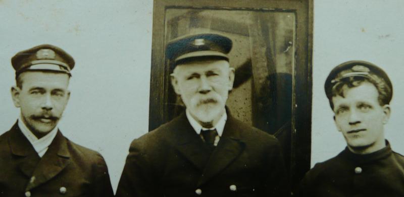 The badge worn by the four figures flanking the Master, appears to be a crenelated tower on a bullion wreath. Any information on identity of shipping line in question, most welcome.
