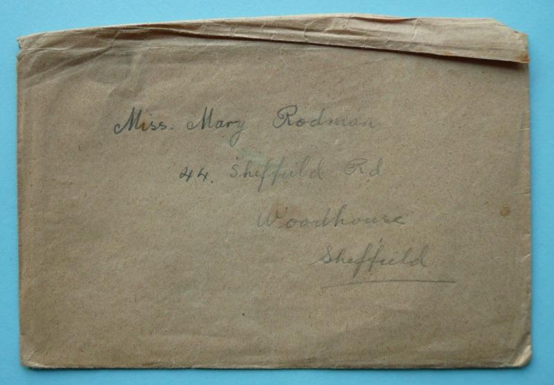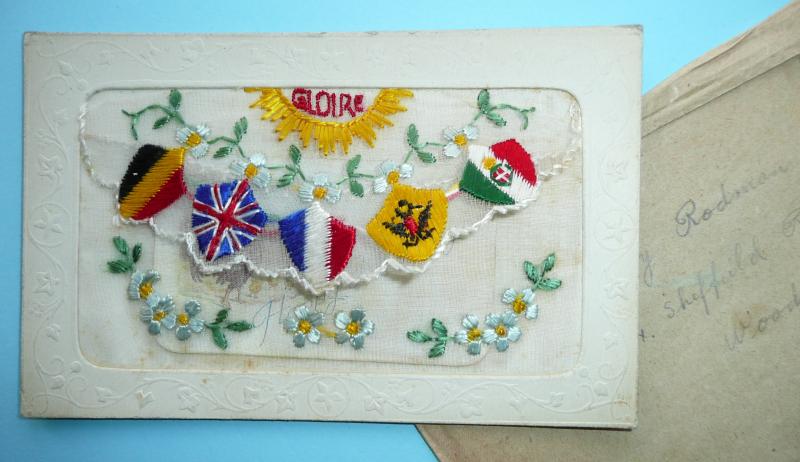Postally unused put pencil message to reverse. French maker. Some mild foxing to front but still in its original protective envelope. Used as a birthday greetings card for a Mr W Rodman, and addressed to a Miss Mary Rodman at 44 Sheffield Road, Woodhouse, Sheffield in Yorkshire. In very good condition for age with with the flags of the Allied Nations.