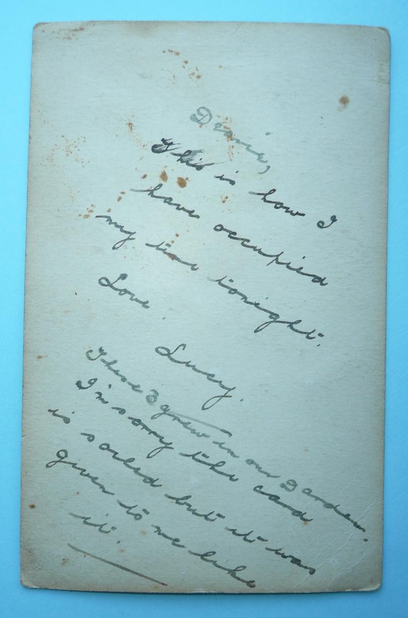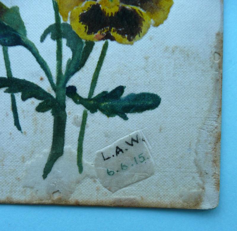 Message on reverse states "Dearie. This is how I have occupied my time tonight, Love Lucy. These 3 grew in our garden. I'm sorry the card is soiled but it was given to me me like it." To front initials L.A.W. dated 6th June 1915.