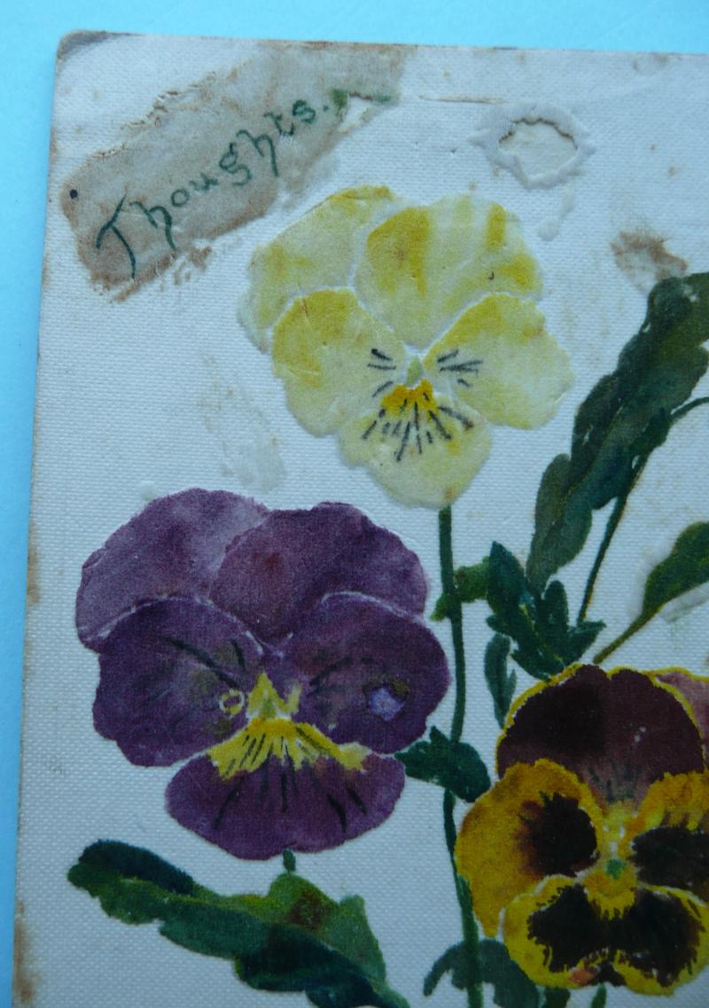 The card does looks soiled but the flowers are original pansies and look just like the ones you can still grow today. I thought this was due to age, being over 100 years old, but Lucy admits on the reverse the card was already soiled. I guess you work with what you are given!