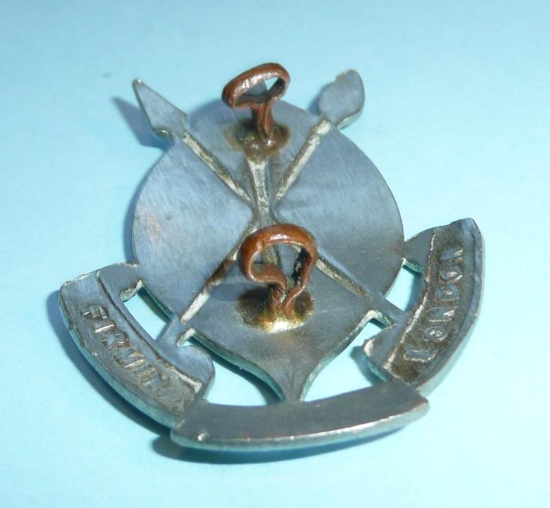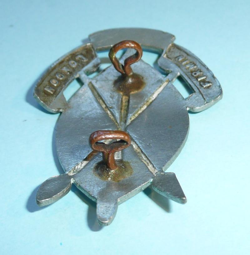 A die cast example with two original copper loops (bottom loop open and twisted but functional). Maker marked Firmin London. Slight loss of detail to front from polishing otherwise in good condition. Worn in WW2 and until 1980.