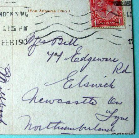 A pre WW1 image judging by their medals, but post Boer War. Wearing undress uniform, their faces and medals are all reasonably clear. The author, appears to be a George Bell, and he writes from Millbank, London " I saw the King this morning". Sent to a Newcastle-upon-Tyne, Northumberland address. Good condition considering it has been Postally used, minor edge damage to each corner, otherwise a fine card.