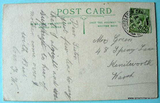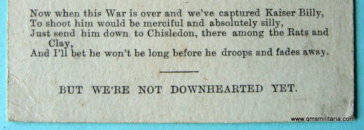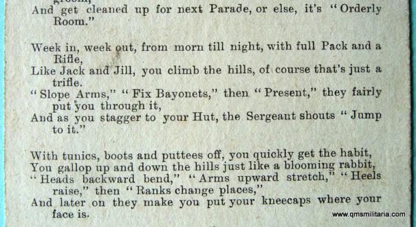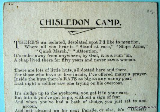An amusing little ditty of a poem about life of army recruit at Chisledon Camp in Wiltshire printed on one side of a postcard, postally used in July 1916. Almost nothing remains of Chiseldon Camp in Wiltshire today. It was set up in 1914 as a training base for up to 10,000 troops at a time, before they went to the front.