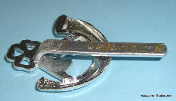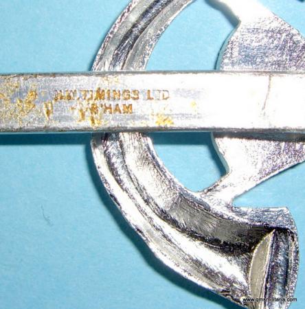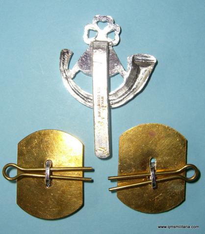 Light Infantry Brigade / Regiment Cap Badge anodised with original slider, impressed H.W. Timings Ltd, B'ham, together with a matched pair of anodised collar badges with single lug fixing to reverse of each and original backing plates.