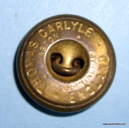 An English made button, post 1902 issue, with floating shank. Maker marked Thomas Carlyle, Aston, Birmingham, England. Circa 24mm in diameter. In great condition with no wear, staining or damage. Scarce maker.