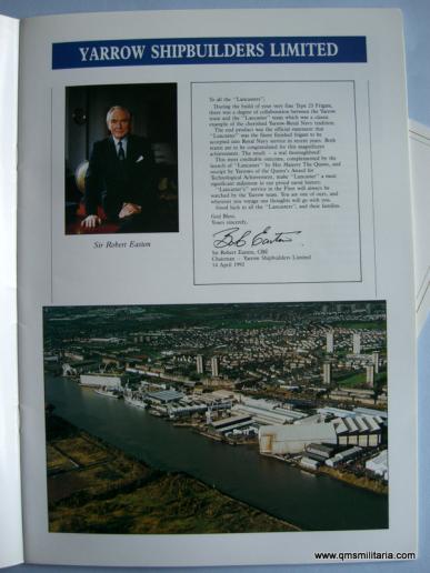 Two items relating to the commissioning of HMS Lancaster at Devonport in May 1992. Built by Yarrow Shipbuilders. If memory serves me HMS Norfolk as the first in class. Complete with Order of Service Booklet. In good condition with crew lists.