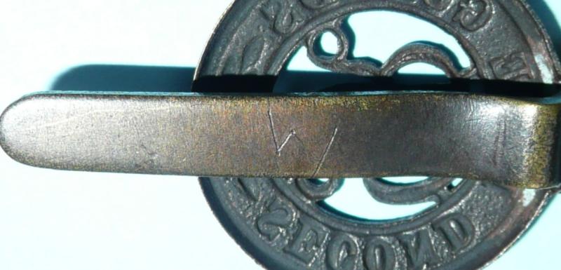 An early WW1 GV pattern cap badge worn from 1913 onwards with original slider to the reverse (a W or M scratched on to it). A good striking, almost mint. Scarce.