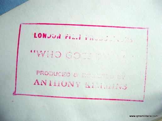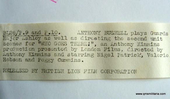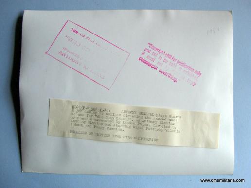 A spiffing looking photo in gloss black and white, large format at 10 inches by 8 inches. The reverse has information about the photo attached to the reverse. The Film "Who Goes There" was made in 1952 and directed by Anthony Kimmins. A lovely Coldstream Guards Major's uniform. A few light marks to image otherwise in good condition.