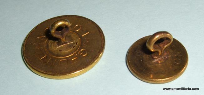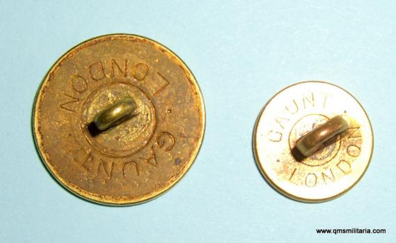 Flat gilt blazer buttons with an engraved St George and the Dragon and a Roman numeral 'V' below signifying that they were belong to the Royal Northumberland Fusiliers. Circa 21mm in diameter and 14mm in diameter respectively, both with fixed shanks and backmarked Gaunt London.