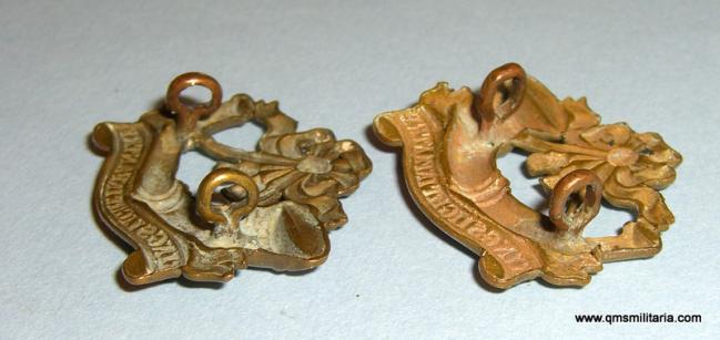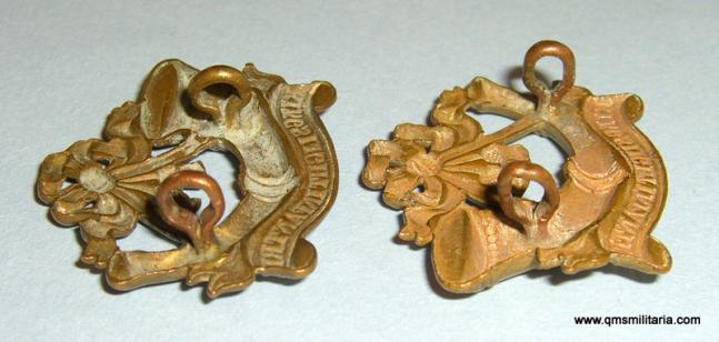 A facing pair of die struck gilding metal collar badges with two original lugs to the reverse of each. Not an exact match on account of a slight colour variation, but in all other respects a good match. According to the Museum, as cited by Churchill, they were unpopular with the Regiment and only worn for one year, 1881 - 1882, even though the pattern that replaced them was not sealed until 1887. Who can say, whether worn for one year, or five years, in either event they are scarce.