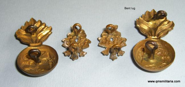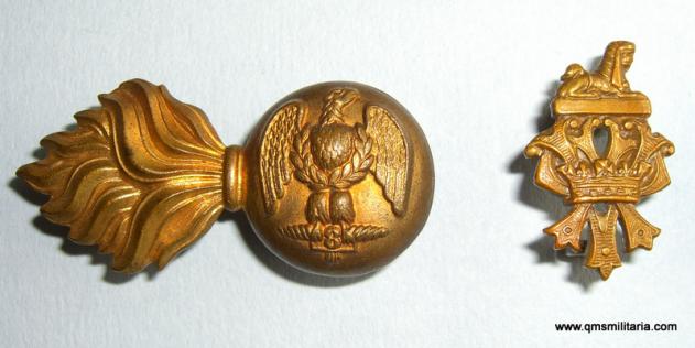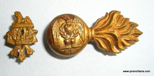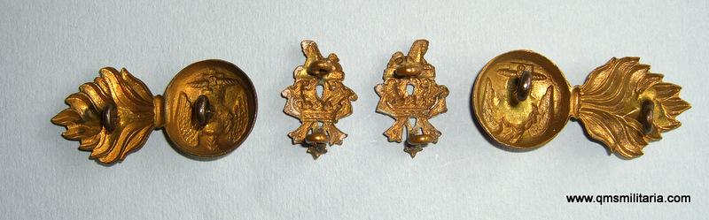 A facing pair of two piece brass collar badges and monograms with all original dark toned loops to reverse. Worn only circa 1882-.1888. One lug on a grenade is bent over but still functional. Some minor staining, but in very good condition. Scarce.