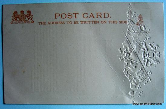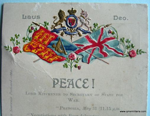 Postally unused. Embossed design, some creasing to centre card of card, blank reverse. Repeats offical messages from Kitchener and the King on the news of Boer surrender in 1902. Coll.