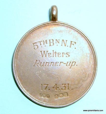 An attractive hallmarked silver boxing medallion / watch fob, neatly engraged to reverse "5th Bn, N.F., Welters, Runner-up, 17.4.31"