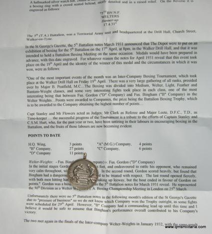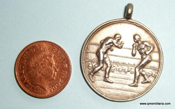 A little bit of sleuthing in the St George's Gazette confirms that this was most probably awarded to Fusilier Bingham of B Company. Medallion is 28mm in diameter, in good condition with some minor wear and light marks. Comes with a page of research and a report of the bout against Fusilier Gordon, who beat him on points. Great image of pugilists in raised relief to the obverse. Birminghan Hallmarks with date letter 'F' for 1930.