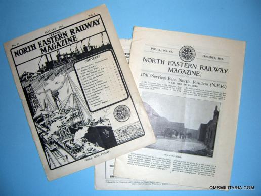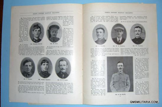 There is a photographic Roll of Honour for early 1915 an several pages of lists of employees who had enlisted in all other units (other than the NER Battalion ( 17th Northumberland Fusiliers ) which were listed in an earlier magazine). It also contains articles on the bombardments of Whitby and Scarborough and accounts of training with the Durham Light Infantry. Very scarce.
