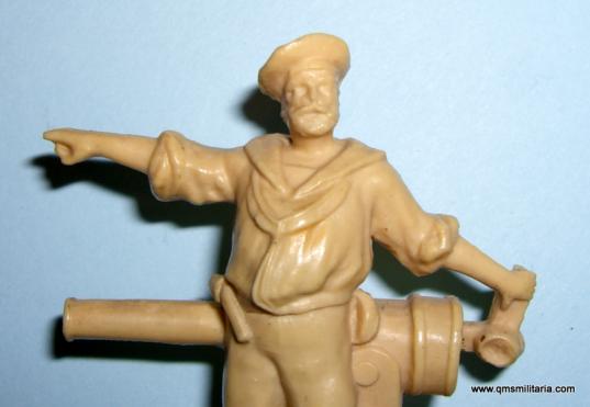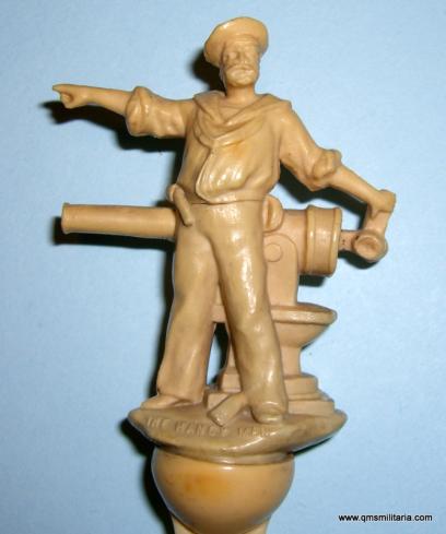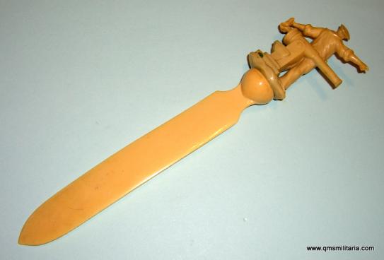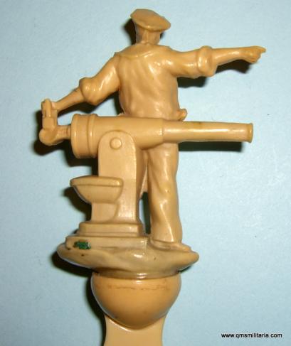 A scarce item, circa 21.5cm long. No damage. The Royal Navy 's answer to the imagery of the Army's A Gentleman in Kharki. False ivorine in look, these celluloid plastic figures were the forerunner of all those Airfix soldiers we used to collect (and it also looks to be 1:32 scale)! They came mounted on a variety of useful household items such as a tot measure, bell, bottle cork, pin cushion and also this letter opener.