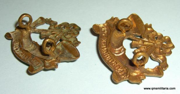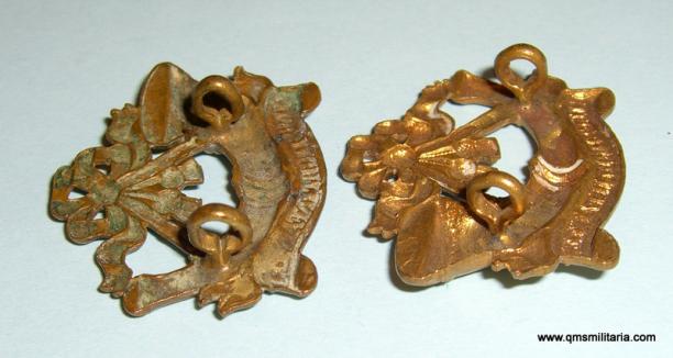 A facing pair of die struck brass metal collar badges with two original lugs to the reverse of each. Not an exact match on account of a colour variation, one is more bronzy in colour, but in all other respects a good match. According to the Museum, as cited by Churchill, they were unpopular with the Regiment and only worn for one year, 1881 - 1882, even though the pattern that replaced them was not sealed until 1887. Who can say, whether worn for one year, or five years, in either event they are scarce.