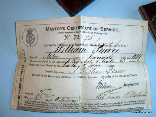 An original numbered vellum certificate issued to William Pearce born in Milor in Cornwall in 1814, but dated 1857, issued by the Board of Trade and stating he had 23 years in the Mercantile Marine including achieving the rank of Master. A quick internet search reveals he lived at Saint Feock, Nr Truro. He was married to Elizabeth and had seven children: 3 sons and 4 daughters. William died in 1893 and was buried in Mylor (copies of internet research supporting the above to be included).