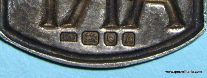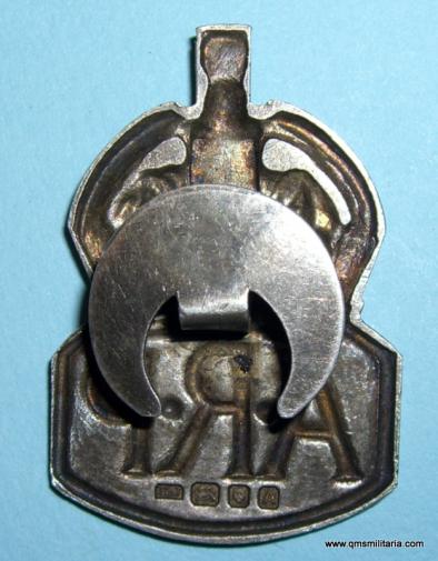 Early pattern, Air Raid Precautions Male Warden's Hallmarked Silver ARP Badge. A good early badge, dark toned condition with original horsehoe fitting, the reverse bearing London silver hallmarks for 1936 ( letter A ) and with maker's details "R.J" (Robert Jay).