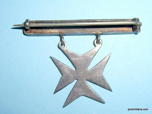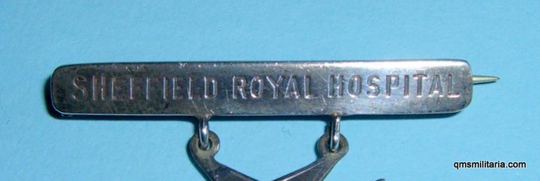 An attractive and scarce First World War unmarked silver nurses hospital badge, maltese cross suspended from a title bar 'Sheffield Royal Hospital'. Good condition, retaining original pin fittings. An attractive item with some tarnishing. 4.3cm wide.
