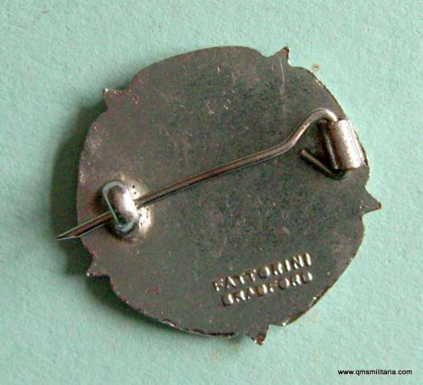 A post WW2 home front badge in white enamel and chrome, with original pin fitting and maker marked Fattorini Bradford. Some wear to the enamel in the form of some light scratches, but not damaged, and otherwise in good condition. Circa 2.7cm across. Scarce. Based on the second pattern Formation Sign for the Northern Command - East and West Riding Area (see my item 59803), which was authorised in September 1951.