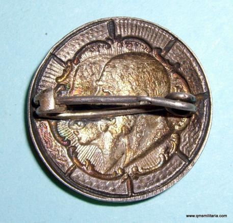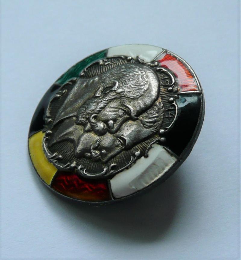 Red, white, black green and yellow enamels surrounding a central white metal device which bears the profiles of the Kaiser and Franz Joseph showing the unity between Germany and Austria. Circa 1914. A fairly large shave off the enamel in one white enamel panel otherwise in good overall condition.