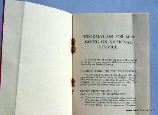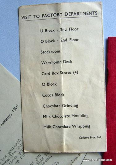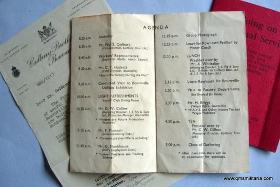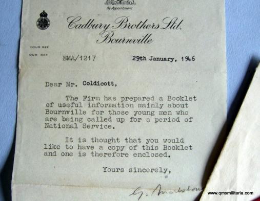 Another example of the philanthropic company Cadbury of Bournville, Birmingham, which comprises a letter dated 1946 to Private Coldicott when on national service, a small Cadbury printed pocket sized red covered booklet (6 pages) giving information to young men going on national service and a programme of events in a leaflet for returning servicemen to this wonderful chocolate making factory. Some crease lines and rusty staples, otherwise in good condition and scarce.