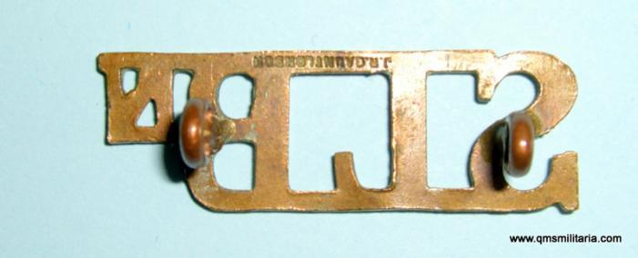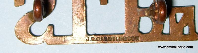 Scarce Sierra Leone Battalion ' SLBn ' brass shoulder title, British made with J.R. Gaunt London stamped to the reverse with both of its original lugs. Worn circa 1901-28. In good condition.