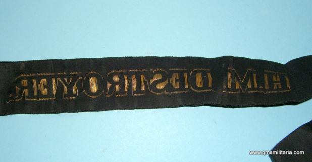 An original embroidered gold thread on black silk ribbon, with swallow tail ends and circa 35 inches ( 68cm ) in length. These "anonymous" cap tallies were intended to ensure that the enemy could not work out which warship was where. Note the full stops.