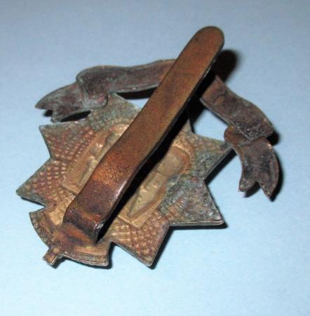 One of the earliest regiment's to adopt a slidered cap badge ( other than for pagri use). Flat topped Victorian crown with a sweat / braising hole behind the white metal castle. In good condition.