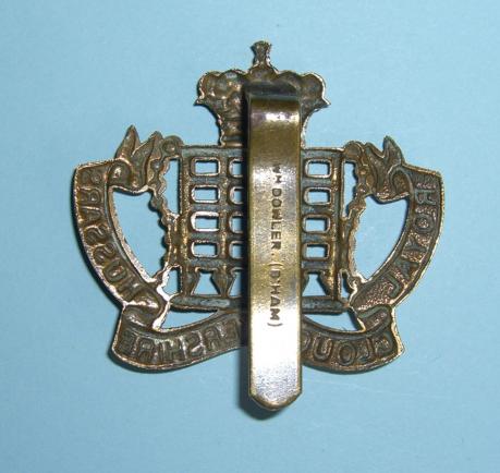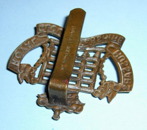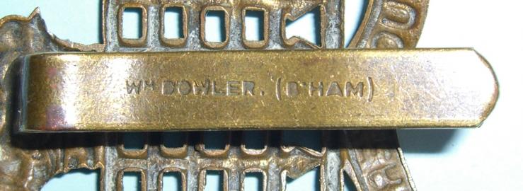 A good heavy die struck cap badge with original slider which is maker marked " Wm. Dowler. ( B'ham ) ". This is one of several naming styles used by Dowler. This pattern of naming is correct, earlier than most and not often encountered. Scarce.