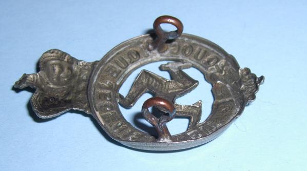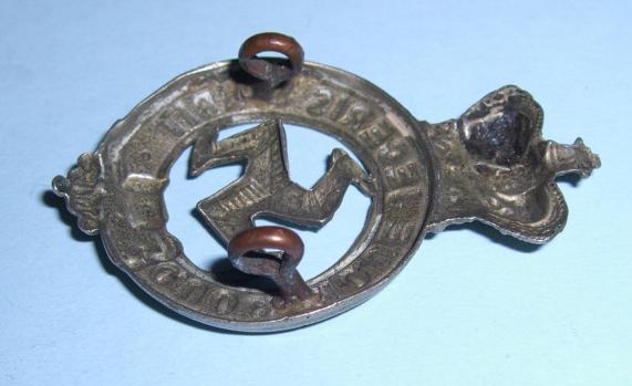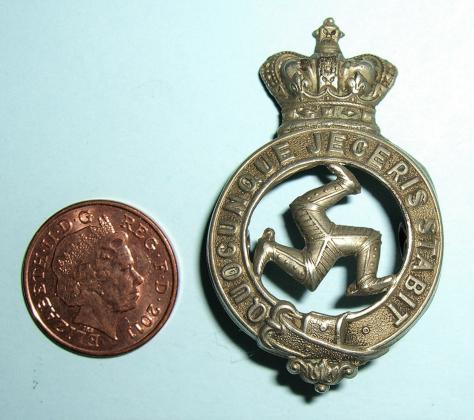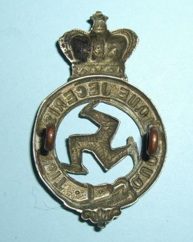 A die struck white metal cap badge with two original dark toned loops to the reverse. The motto " Quocunque Jeceris Stabit " which is rather appropriate given the three legged device to the centre and translates as " whichever way you throw him he will stand ". It was also the motto adopted by the Home Guard of the island in WW2. Circa 4.7cm tall. Some evidence of service wear otherwise in good condition and rare. This pattern worn circa 1896 to 1901.
