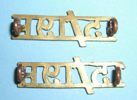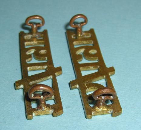 A matched pair of shoulder titles with two original loops to the reverse. Smaller officer 's pattern as noted in Westlake. Circa 4.2cm wide and 1cm tall (excluding the forward slash). In very good condition. (See my item 57768 for the larger pattern other ranks version).