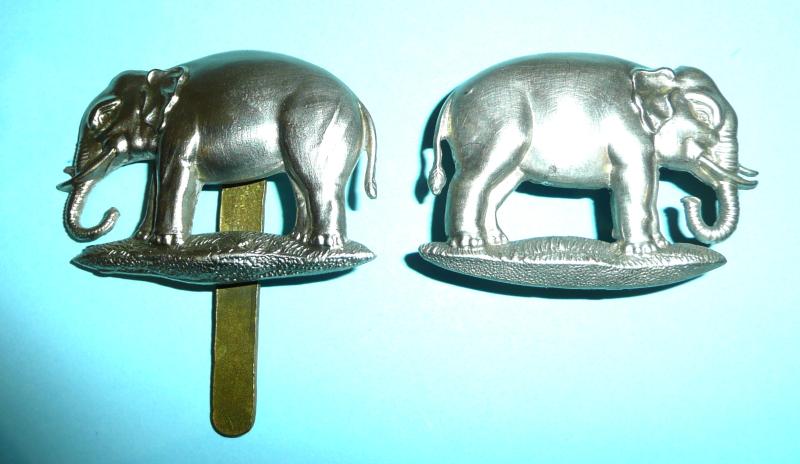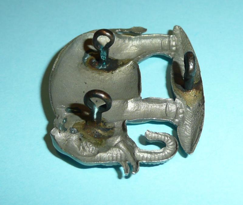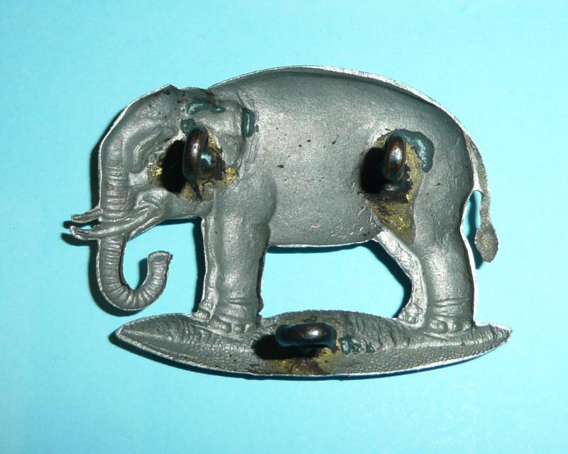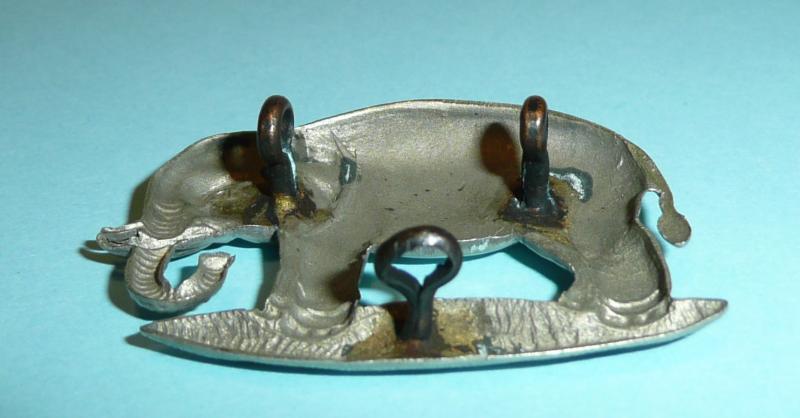 A scarce right facing white metal NCO 's arm badge, open backed with three dark toned loops to the reverse. In lovely condition with fiddly bits present and correct. Not to be confused with the left facing elephant of virtually the same design which was worn either on the tropical sun helmet with a slider fitting or on the field service cap with loops. A left facing elephant pagri badge is included alongside in the final photo for comparison and interest, it is not being sold with this item but is listed elsewhere.