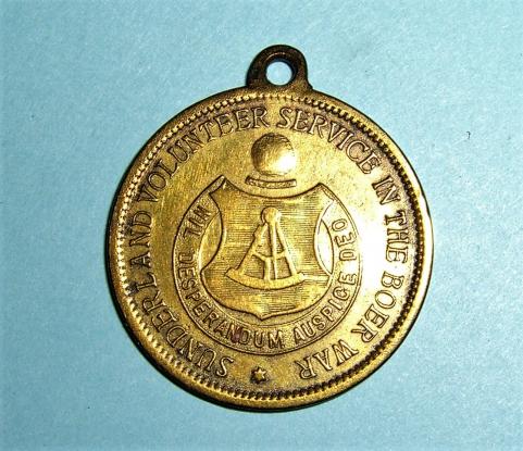 Boer War medallion. Gilt on copper, small medallion with suspension ring. Circa 23mm in diameter. Arms of City of Sunderland to the reverse. In good condition. Scarce.