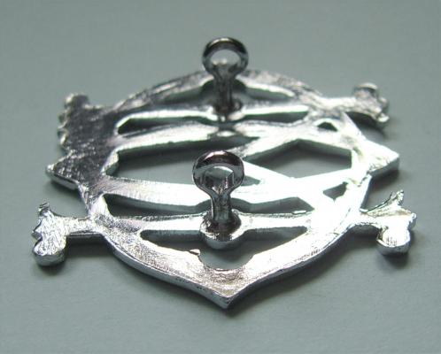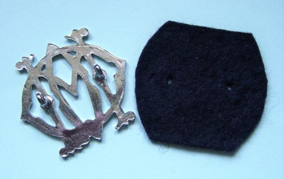 A 1970s issue, flat die cast in chrome with two original lugs to the reverse. Circa 39mm tall and 42mm wide with loops EW (19mm gap). With dark blue felt backing. It came with this but cannot determine whether this is correct or not. It certainly displays better with it.