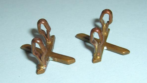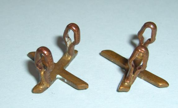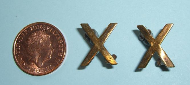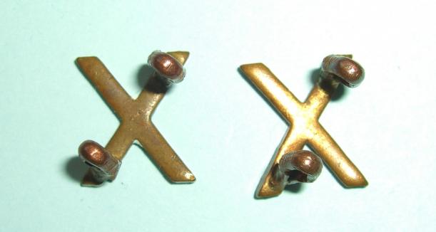 A small matched pair of brass Roman numeral X collar badges with two original elongated loops to the reverse of each. Circa 1.5cm tall and 1.2cm wide. Some service wear but in good condition. Scarce