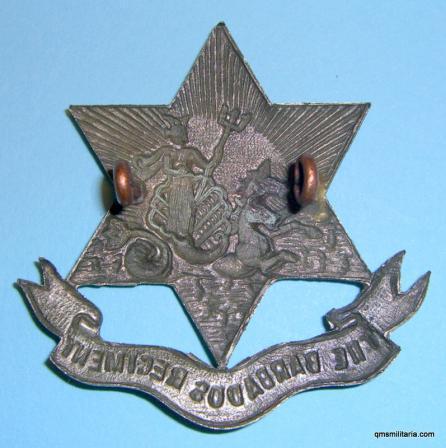 An extremely attractive and scarce cap badge (post 1948 issue), well made in white metal to the Defence Force of the Caribbean Commonwealth island of Barbados. Two original lugs (east -west). Slight polishing to finer high points, but about 9 out of 10 condition-wise. 5.1cm across and 5cm high.