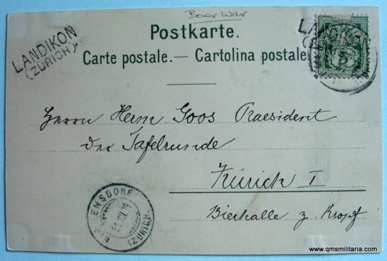 Postally used, posted in 1899 from Zurich, Switzerland. Unable to translate message or address, but card is in excellent condition, especially as it has been posted. The Swiss stamp has some minor wear to top border. Scarce.