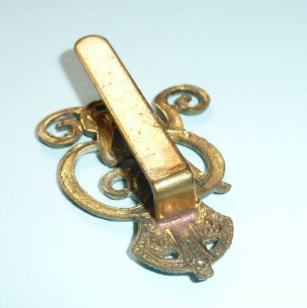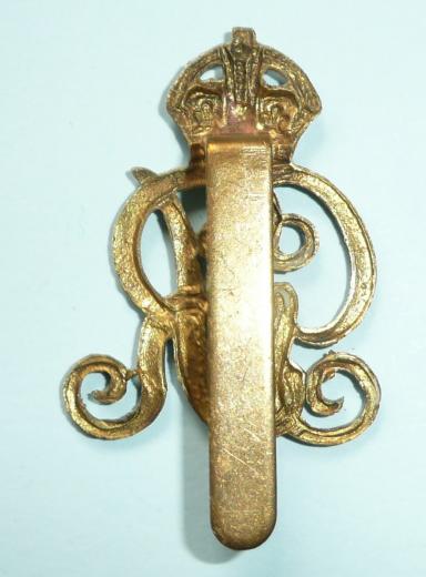 Brass cap badge with original slider to the reverse. In the form of the Royal Cypher for King George V. As worn 1911 to 1935. Circa 4cm tall. In good condition. D80.6