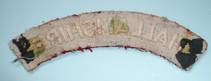Removed from uniform. White on red embroidered shoulder title, glue and paper marks to white hessian reverse. In good condition. Relatively scarce.