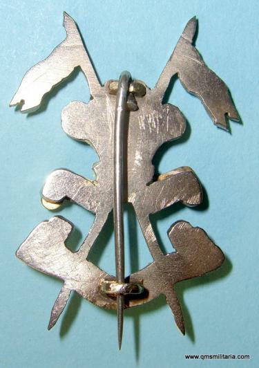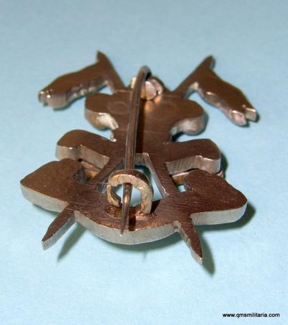 A very fine unmarked silver & gilt officer's pagri cap badge to the 5th Probyns Horse, now an armoured regiment of the Pakistan Army. Original pin fixing and c clasp to the reverse (north-south). Circa 4.4cm tall. This is the post 1956 issue as the "Ich Dien" has been replaced by Urdu script. In 1956, Pakistan became a republic and all titles pertaining to British royalty were dropped, although they did retain the POW feathers in the design.