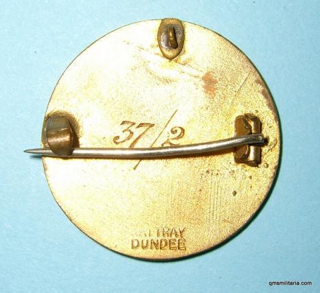 An attractive gilt and enamel badge which shows the crest of the city of Dundee, 29mm in diameter. It is engraved with 37/2 and has the maker's details on the reverse Rattray, Dundee. It also has an extra loop mounted on it for a safety chain (the safety chain is no longer present). In good condition with only a small bit of surface damage to the surface of the enamel at about 1 o'clock.