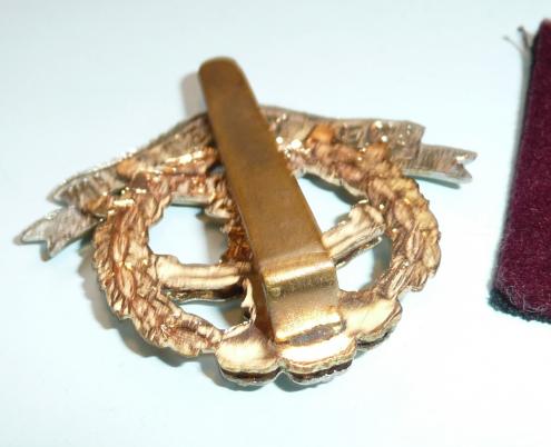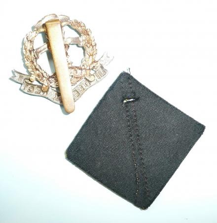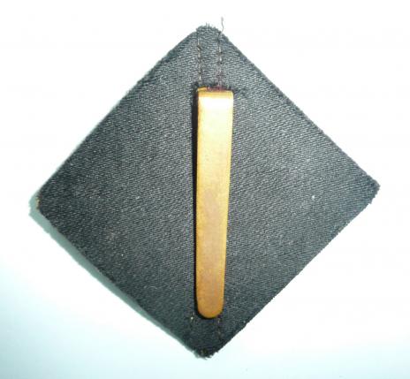 Most probably a WW2 issue as no evidence of braising holes to reverse. A diamond back badge in the regiment's regimental colours (in equal portions) of gold yellow and dark maroon sewn onto a satin black material backing. The badge backing was in use during WW1 by over forty battalions. Then it dropped out of use, until adopted again during WW2 (source: Badge Backings & Special Embellishments of the British Army p81).