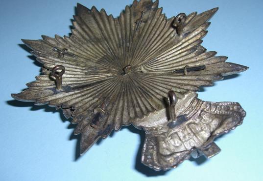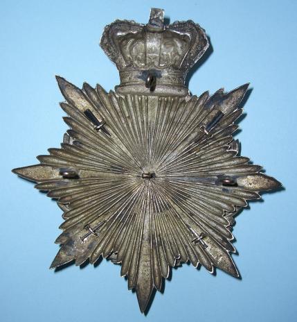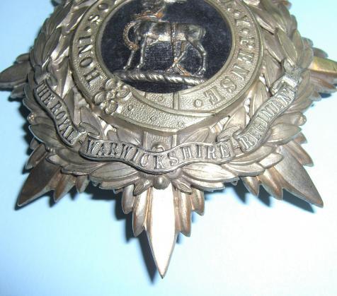 A star of eight points, the topmost point displaced by a Victorian crown. On this a laurel wreath. Within the wreath a strap inscribed the garter motto Honi Soit Qui Mal Y Pense. In the centre the regimental device of the Warwickshire Regiment, an antelope with a coronet around its neck and chain attached standing on a torse on a black velvet cloth background. An applied scroll below: "The Royal Warwickshire Regiment". Interesting there is no battalion number, could this be militia?