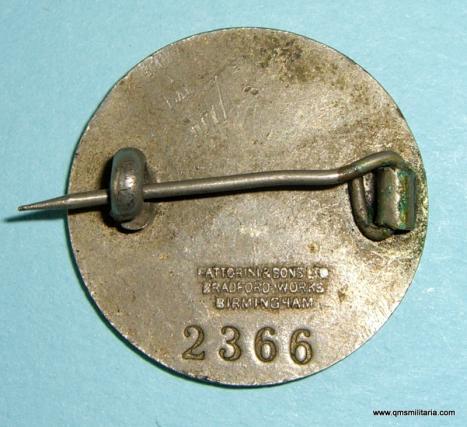 A white metal badge for Vital War Work, Fine Cotton Spinners & Doublers, with original pin back fitting. Maker marked Fattorini & Sons Ltd, Bradford Works, Birmingham and impressed with the number 2366.