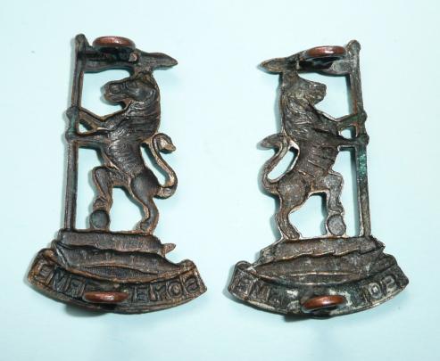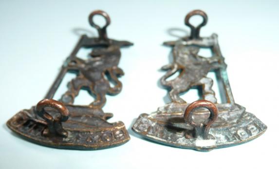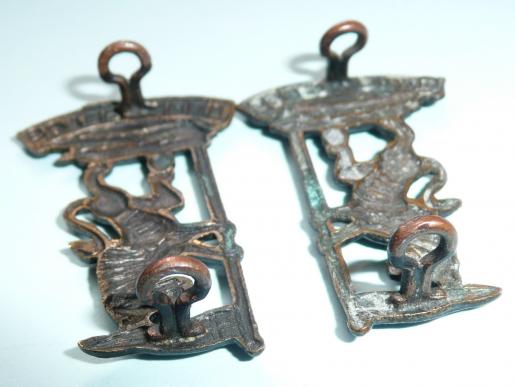 A matched facing pair of die struck collar badges with two original loops to the reverse of each. The cap badge and collar badges were the same size. The collars were worn facing inwards, the cap badge faced to the left. Circa 4cm tall. A lovely set with virtually no wear to the black finish.