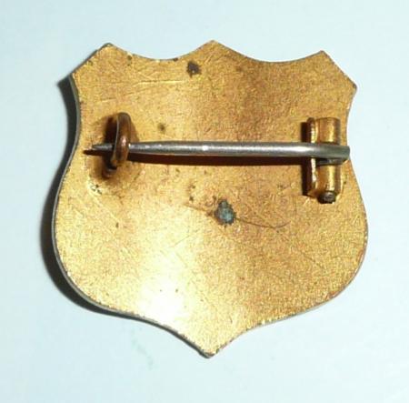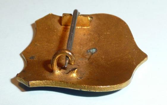 A scarce original First World War period Sutherland Highlanders sweetheart brooch in the form of a gilded brass convex shield inlaid with vivid blue enamelling, bearing the crest within the badge of this regiment. In very good condition, retaining original pin fittings, enamel in very good condition and intact (slight surface mark here and there), gilt remains bright. Circa 2.7cm tall.